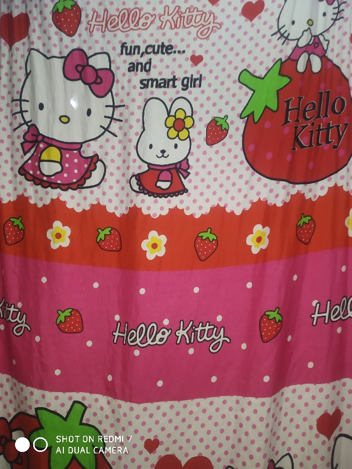 The image displays a vertically hung, multi-paneled fabric, likely a curtain or wall hanging, predominantly patterned with Hello Kitty themes. The top section features a white background with small pink polka dots. This section includes a large Hello Kitty character wearing a pink polka-dotted dress and a pink bow, alongside a white rabbit character in a red dress with a yellow flower on its head. Text in black reads "fun, cute... and smart girl," with "Hello Kitty" in red cursive visible at the top. This panel also shows several red strawberries with green leaves, small red hearts, and a Hello Kitty head emerging from a large red strawberry labeled "Hello Kitty." Below this, a scalloped white border separates a red horizontal band decorated with small yellow and white flowers and additional red strawberries. Following this is a solid pink horizontal band with small white polka dots, featuring repeated "Hello Kitty" text in white cursive and more red strawberries. The bottom edge shows a partial view of a white background with pink polka dots, including red hearts and strawberries, indicating a repeating pattern. The fabric displays minor folds and a slight sheen. A digital watermark reading "SHOT ON REDMI 7 AI DUAL CAMERA" is present in the lower left corner. No individuals or specific interactions are depicted. The exact location within the city of Cipinang, Indonesia, cannot be determined from the visual information provided in the image.