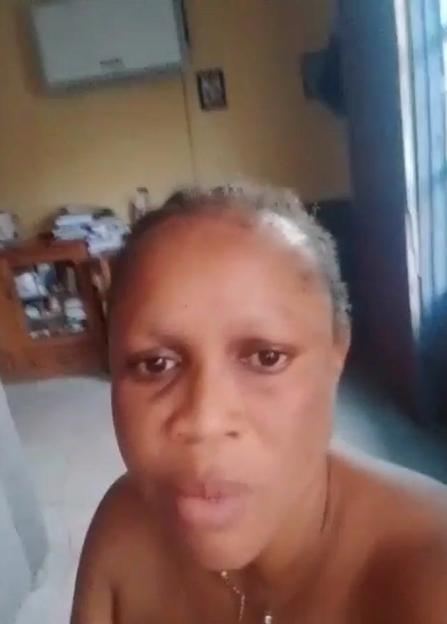 woman with light brown skin, short hair, and a gold necklace sitting in a room. She is looking directly at the camera. Behind her is a desk with various items on it, a window, and an air conditioner on the wall. She raises her right hand and touches her forehead. The audio includes a song.