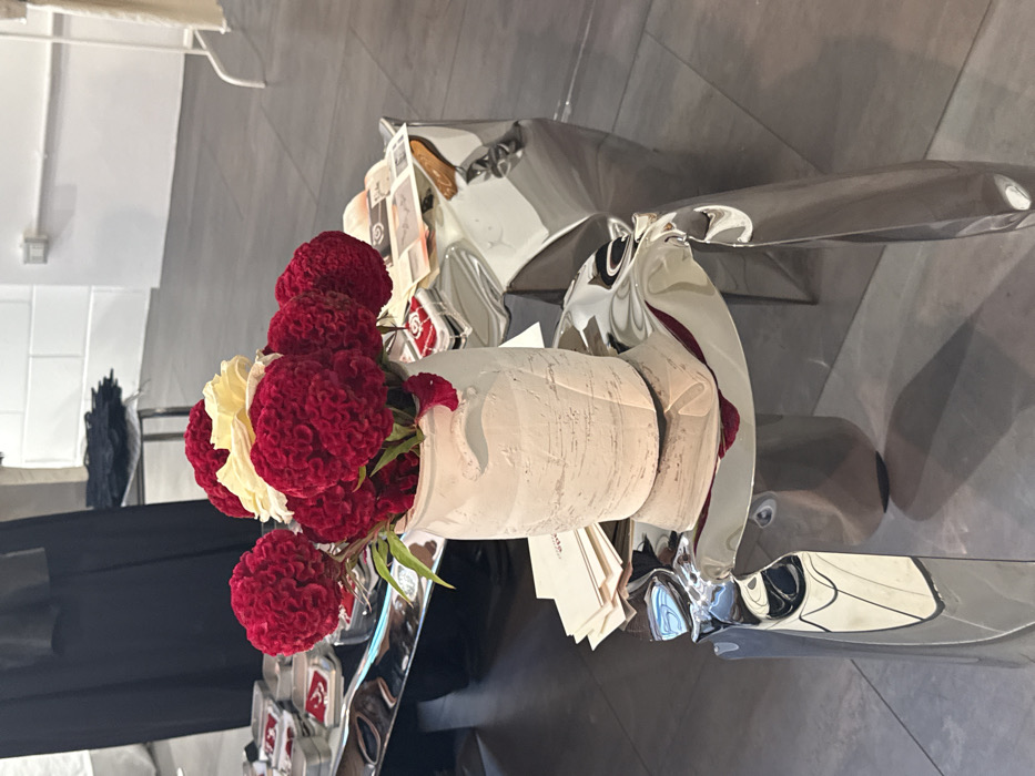 This static, interior photograph depicts a contemporary display arrangement within a commercial or event space, likely in a fashion or design context in Milan, Italy, though an exact location is not discernible. In the central foreground, a textured, distressed white ceramic vase holds a bouquet of vibrant red celosia flowers and several pale yellow, rose-like blooms. A single red petal rests on the vase's rim. This vase sits atop a highly reflective, irregularly sculpted chrome or polished metal stool/pedestal, which distorts reflections of the surrounding environment. To the immediate left and right of the vase, on additional sections of similar irregularly shaped, highly reflective chrome surfaces, various items are displayed. On the left, multiple small, rectangular silver-colored tins featuring red designs are arranged alongside stacks of white paper cards or brochures. Behind these items, a draped dark, possibly black, fabric element is partially visible. On the right, more stacks of white cards and an open magazine or catalog are present. The background consists of plain white walls, some exhibiting subtle block-like paneling. An electrical outlet is visible on the far right wall. The floor is dark grey, consistent with large tiles or concrete. In the deeper background on the right, a white clothing rack with a light-colored garment is faintly discernible, along with another dark table supporting dark accessories. No individuals are present in the scene.
