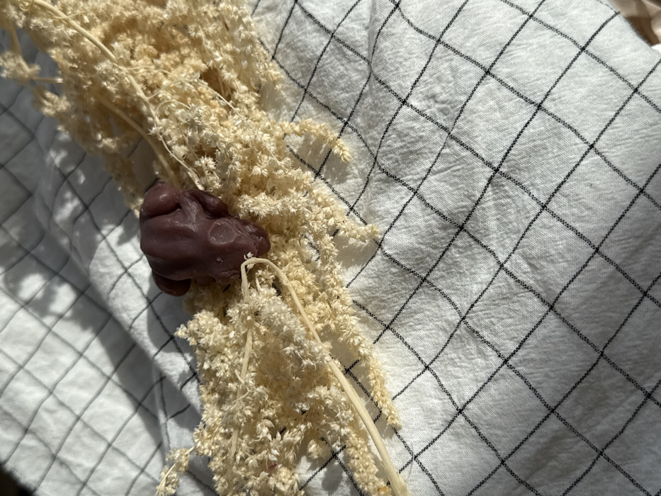 A close-up, top-down perspective depicts a still life arrangement on a white, checkered fabric surface. The fabric exhibits a grid pattern of thin black lines and has visible creases. Centered in the upper half of the frame is a small, dark reddish-purple, textured object resembling a stylized frog or toad in a crouched position. Beneath and partially surrounding this object is a cluster of dried, light beige botanical material, characterized by a fluffy, feathery texture, extending horizontally across the upper portion of the scene. Strong, directional lighting originates from the upper left, casting distinct shadows from both the frog-like object and the botanical material onto the checkered fabric. No specific location within Krasnodar, Russia, is discernible from the visual evidence presented in the image. There are no individuals, actions, or interactions depicted.