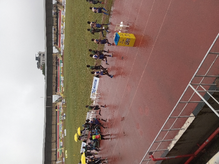 Athletes run on a wet track in a stadium