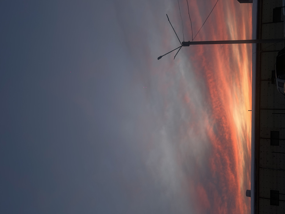 The image depicts an exterior scene at twilight in Chaikovsky, Russia, dominated by a vibrant sunset. The upper two-thirds of the frame showcase a sky transitioning from intense orange and red hues at the lower horizon to gray and dark blue overhead. Scattered clouds are present, illuminated by the setting sun. Two faint reddish-pink points of light are discernable in the upper-middle left portion of the dark blue sky. Across the lower third of the image, a long, dark, industrial-style building or fence structure with a flat, snow-covered roof is silhouetted against the bright sunset. In the lower-right foreground, a dark street light pole with two horizontal cross arms and utility wires extends vertically, also silhouetted. The top portion of a dark vehicle is partially visible in the bottom-center, positioned below the building structure. No individuals or explicit actions are observed. The environment suggests an urban or industrial area during either dawn or dusk, with prevailing cold weather conditions indicated by snow accumulation.