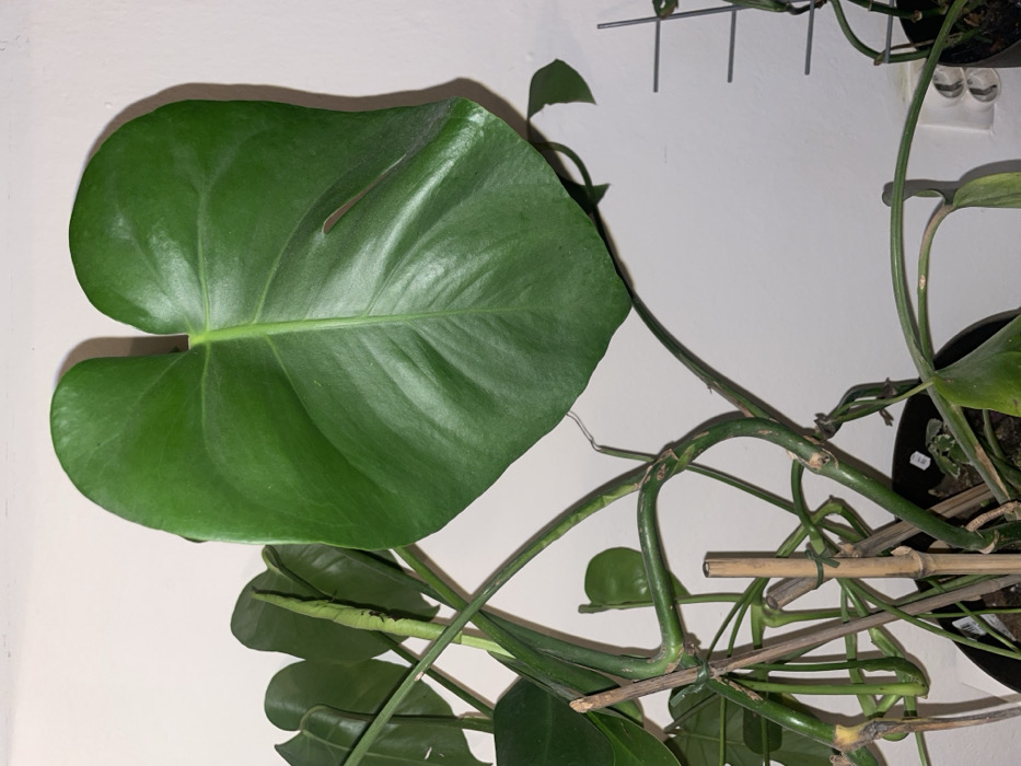 The image depicts an indoor botanical scene within an unidentified location in the city of Danilovgrad, Montenegro. A large, dark green, heart-shaped leaf, consistent with a *Monstera* species, occupies the upper right portion of the frame, displaying a light brown linear abrasion approximately 3 centimeters in length on its surface, to the right of the central vein. To the left of this prominent leaf, a tightly rolled, unfurling new leaf shoot, lighter green in color, extends vertically. The plant's thick, segmented green stems are visible, supported by several light brown bamboo stakes secured with thin ties, forming a structural network in the lower and central sections. The base of the plant is contained within a dark-colored pot, partially visible at the bottom left. A smaller, separate plant with a metallic square-grid trellis is partially visible in another dark pot on the far right. The background consists of a plain, light-colored wall, exhibiting shadows cast by the plant, suggesting a light source from the upper left. A white electrical outlet with two circular receptacles is partially visible on the lower right section of the wall. No individuals are present, and no dynamic actions or interactions are depicted.
