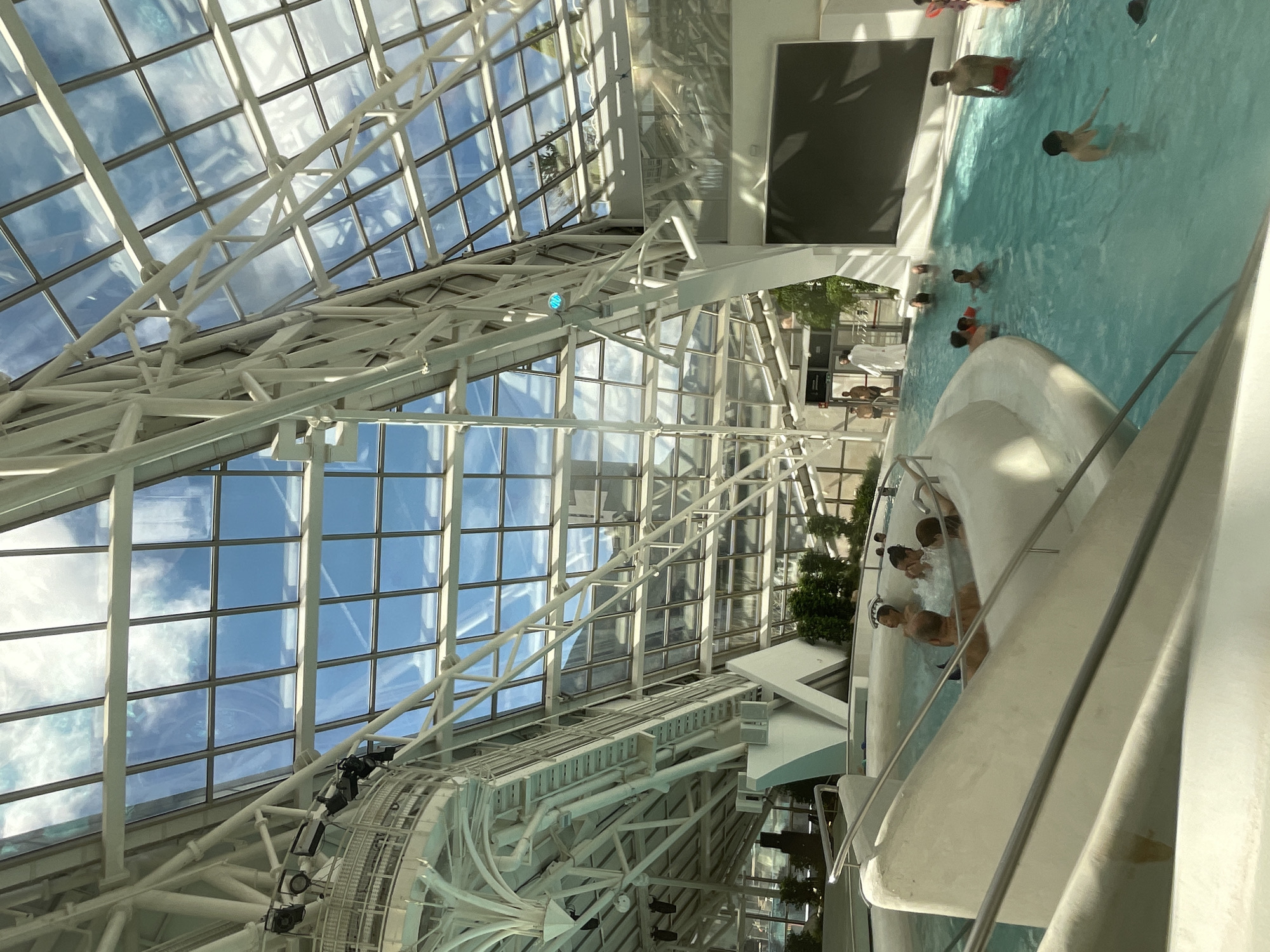 This photograph shows a water park located in Les Escaldes, Andorra. The park features a large, glass-domed roof with a white, geometric support structure. The sky is visible through the glass, showing scattered clouds. Inside, there is a pool with several people swimming and standing in the water. A white water slide is partially visible on the right side of the image. There is a large black screen mounted on the wall. Some green plants are visible near the pool area. The image is taken from an angle looking upwards towards the roof and downwards into the pool area.