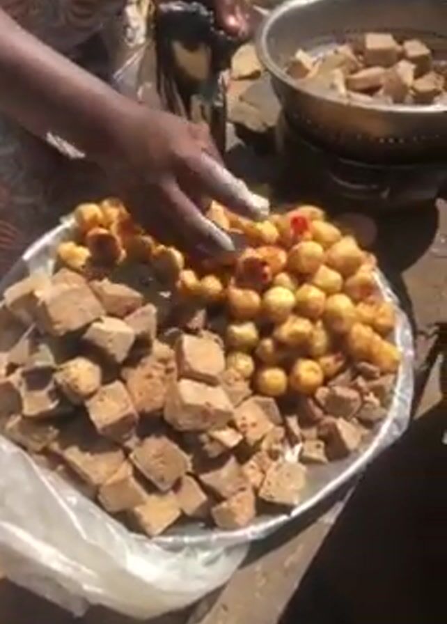 person preparing food. A woman wearing a patterned dress is using her hands to put a red, pasty-looking substance onto what appear to be fried balls and diced cubes of a brown food on a silver platter. There is a plastic bag underneath the left side of the platter. In the background, is a metal bowl with more of the brown food inside.