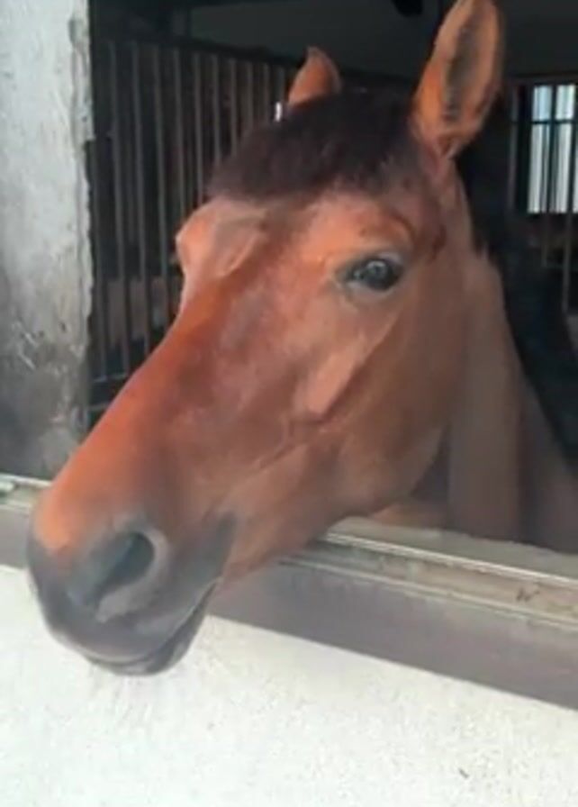 A close-up video shows the head and upper body of a brown horse in a stable. The horse is looking towards the camera, its head is partly sticking out of an opening. The stable has metal bars.