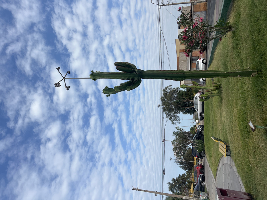 The image displays an urban scene in Arica, Chile, featuring a park-like median under a sky densely populated with white cumulus clouds. Centrally positioned is a tall, multi-branched columnar cactus, approximately 4 to 5 meters in height, from which a metal pole extends upward, topped by a street light fixture composed of four lamps arranged in a cross configuration. The foreground consists of a green grassy area. To the left, a curvilinear paved pathway adjoins the grass, alongside a yellow and brown slatted park bench, and a reddish-brown rectangular trash receptacle. A slightly tilted utility pole with overhead wires is visible further left. Several smaller columnar cacti are scattered within the grassy expanse. To the right of the primary cactus, a pink-flowering oleander bush grows near a concrete curb separating the median from a paved road. The multi-lane road in the midground contains several vehicles, including a dark SUV, a red SUV, a black SUV, a silver SUV, and a white hatchback, indicating vehicular presence or movement. In the background, additional utility poles support a network of overhead wires that span horizontally across the frame. Trees and shrubs with green foliage partially obscure low-rise buildings with facades ranging from brick to light-colored finishes. No individuals are observed within the scene. The lighting suggests daylight conditions.