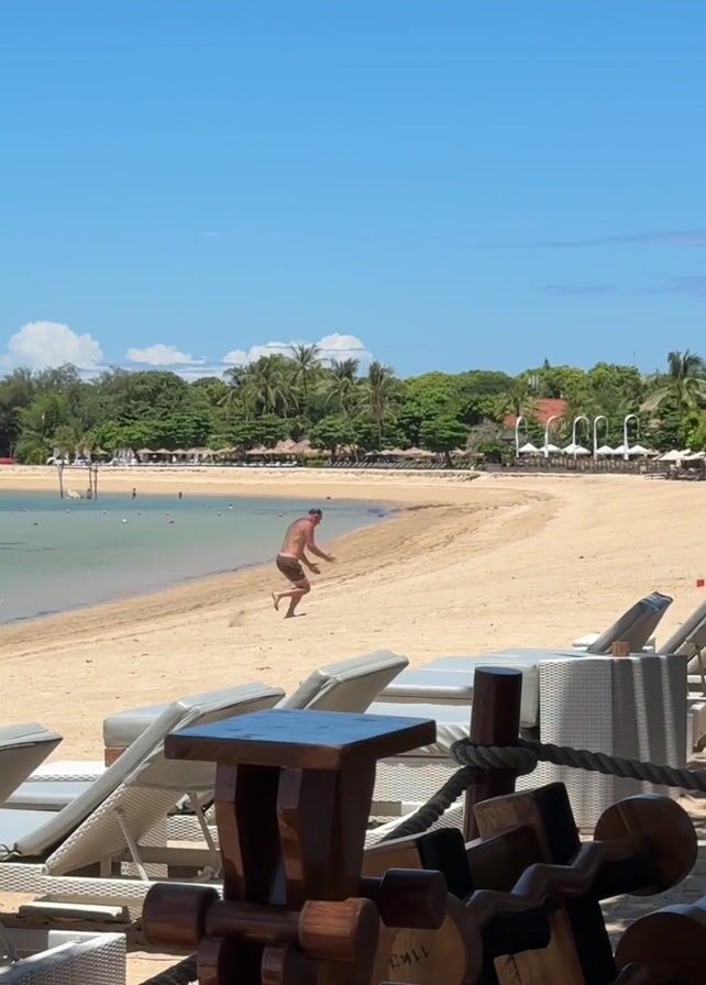 On a bright, sunny day, a man in swimming trunks is jogging along a sandy beach toward the right of the frame. In the foreground, there are several lounge chairs and a wooden table with decorative wooden weights, suggesting a patio or outdoor seating area. The beach is lined with palm trees and white umbrellas in the background. As the man runs, another person walks into the frame from the right, closer to the camera, slightly obscuring the view. The overall scene is a typical beach setting on a pleasant day.