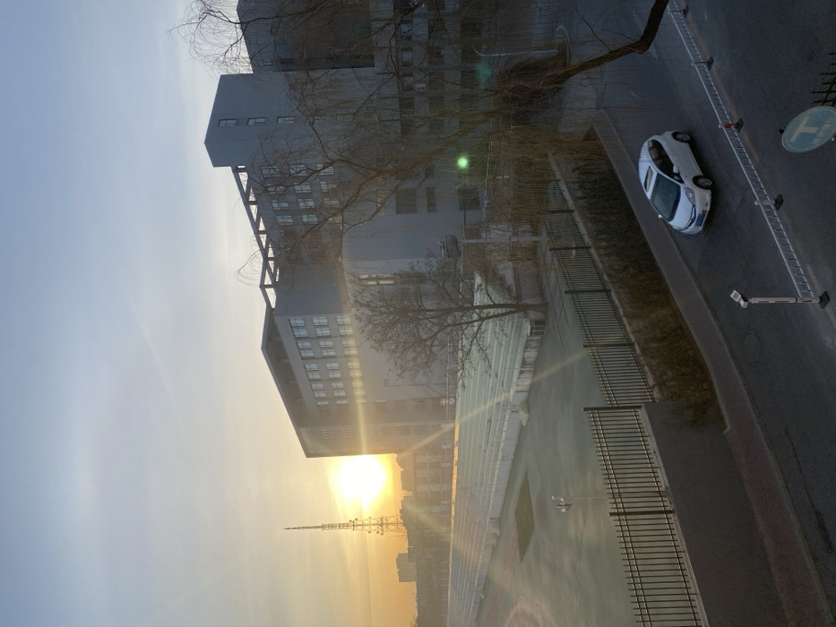 From an elevated perspective, a building rises against a backdrop of a bright, hazy sunrise or sunset. A bare tree stands in front. Below the building, a fenced area or yard is visible. A street runs alongside this area, with a white car parked on it. A helipad marking is painted on the road.