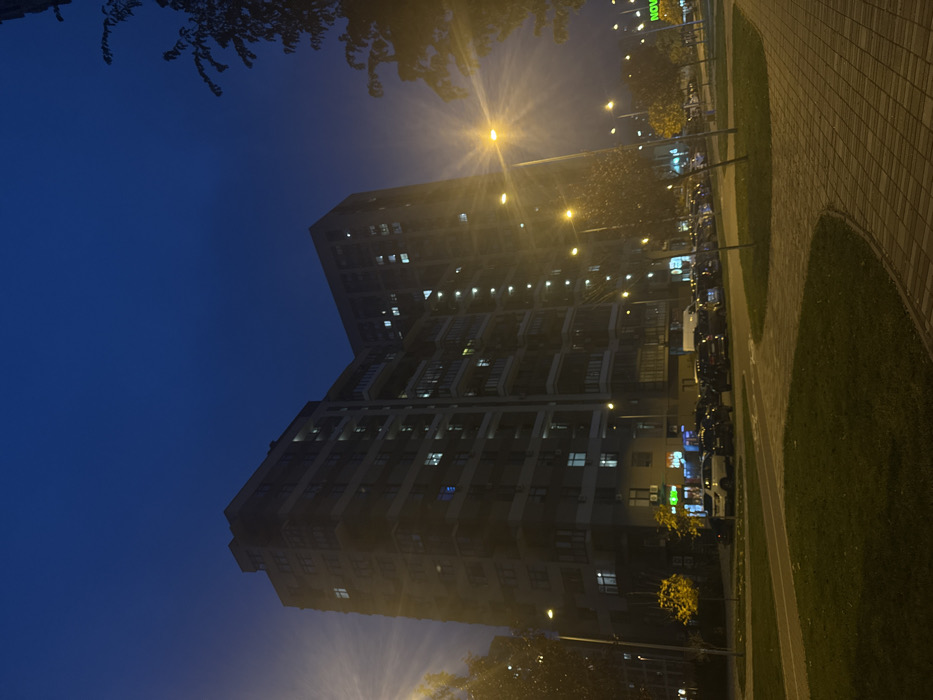 The image depicts a nighttime urban street scene in Kyiv, Ukraine. A prominent multi-story residential building, approximately 10-12 floors high with a complex, potentially L-shaped architectural footprint, dominates the background. Numerous windows are illuminated, and balconies are visible on its facades. The ground floor houses multiple commercial establishments, including one with a distinct green-and-white "NOVA" sign, characteristic of Nova Poshta, located on the right side of the building, and other illuminated storefronts on the left. In front of the building, a paved road features approximately 15-20 parked vehicles, comprising sedans, SUVs, and a white cargo van, oriented away from the camera. The immediate foreground showcases a landscaped public space, consisting of a grassy median containing small, deciduous trees and shrubs, some displaying yellow foliage. This green area is bordered by a curving pedestrian pathway constructed from light-colored interlocking pavers. Artificial illumination emanates from numerous streetlights, casting a warm yellow-orange glow and producing distinct lens flares. Additional light sources include the building's illuminated windows and commercial signs. The sky overhead is a deep, uniform dark blue. No individuals are visible within the captured frame, presenting a static moment of urban environment.