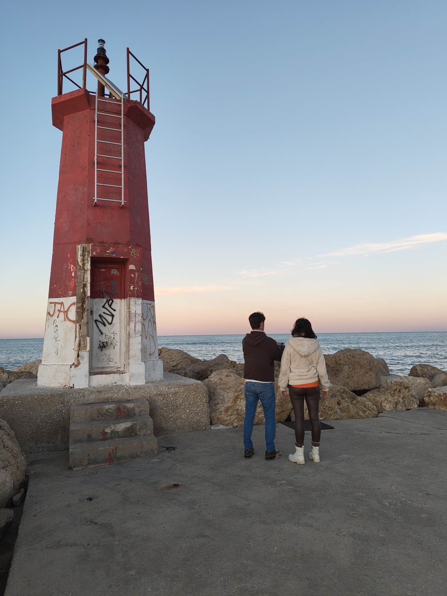 A vertical, full-shot photograph depicts a red and white lighthouse, along with a man and woman facing the sea. The lighthouse stands to the left of the frame. It is a tall, red structure with white accents near its base. A white ladder is affixed to one side. Graffiti marks the base of the lighthouse, including a door that seems slightly ajar. To the right of the lighthouse, a man and woman stand on a concrete platform. They are positioned with their backs to the camera, looking toward the sea. The man is wearing a brown jacket and blue jeans. The woman is wearing a light-colored hoodie, brown pants, and white boots. They are standing next to a series of large rocks. In the background, the sea meets a soft, pink-tinged sky. The photo was likely taken during sunset, given the lighting. Based on the lighthouse and the rocky coastline, the image is likely taken in the city of Dénia, Spain. Dénia is known for its lighthouses along the coast.