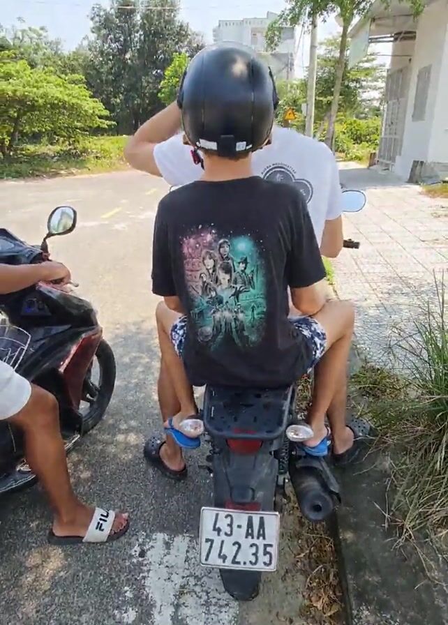 Three people are riding motorcycles. The camera faces the handlebar of one of the motorcycles, looking past a second motorcycle with two riders, and over to a third motorcycle with two more riders. The second motorcycle has a license plate number 43-AA 742.35. The first rider on the second motorcycle is wearing a black t-shirt with an image on the back, blue swim trunks, and blue flip flops. The second rider on the second motorcycle is wearing a white t-shirt. The riders are sitting on the motorcycles at a crossroad of a paved road. On the left side is a curb with green grass and a few small trees. The third motorcycle has a man and a woman riding it. The man is wearing a white button down shirt and white shorts. The woman is wearing a black and white striped crop top and white shorts. Both the man and the woman are wearing a light-colored helmet. The man on the third motorcycle looks to the right, while the woman looks to the left and laughs.
