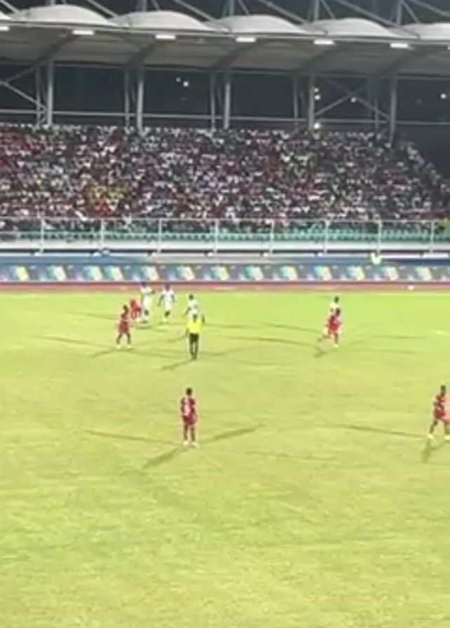 soccer game taking place at night in a stadium filled with spectators. Players wearing red uniforms are positioned on the field, preparing for a play. A referee wearing yellow stands among them. Opposite them, players in white uniforms line up near the goal. Above the field, a large screen displays an image. The field is well-lit, and the stadium's structure is visible in the background.