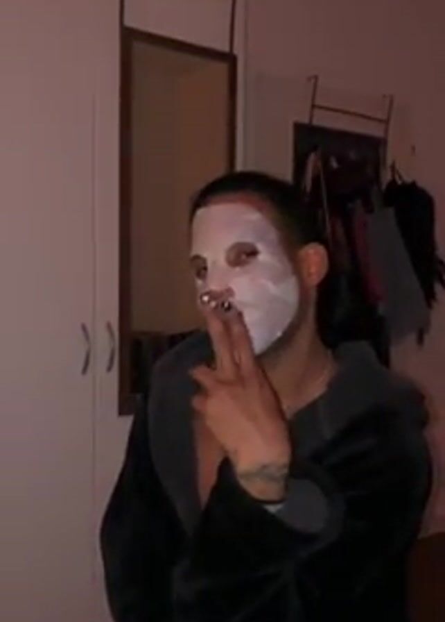 A man with a white sheet mask covering most of his face is smoking a cigarette. The man is wearing a dark gray robe and has a tattoo on his left forearm. He is indoors, standing in front of a white wardrobe. There is also a mirror and some clothes hanging on a rack visible in the background.