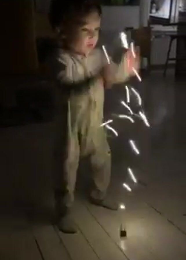 A toddler, approximately 1-2 years old, dressed in a light-colored romper with a pattern of bears, stands on a wooden floor. The room is dimly lit. The toddler holds a string of white fairy lights and is actively shaking or swinging them. Some of the lights are resting on the floor. In the background, there are pieces of furniture, including a chair, a table, and a bar stool, as well as a large window with a view of foliage outside. The toddler appears focused on the lights, occasionally glancing down at them.