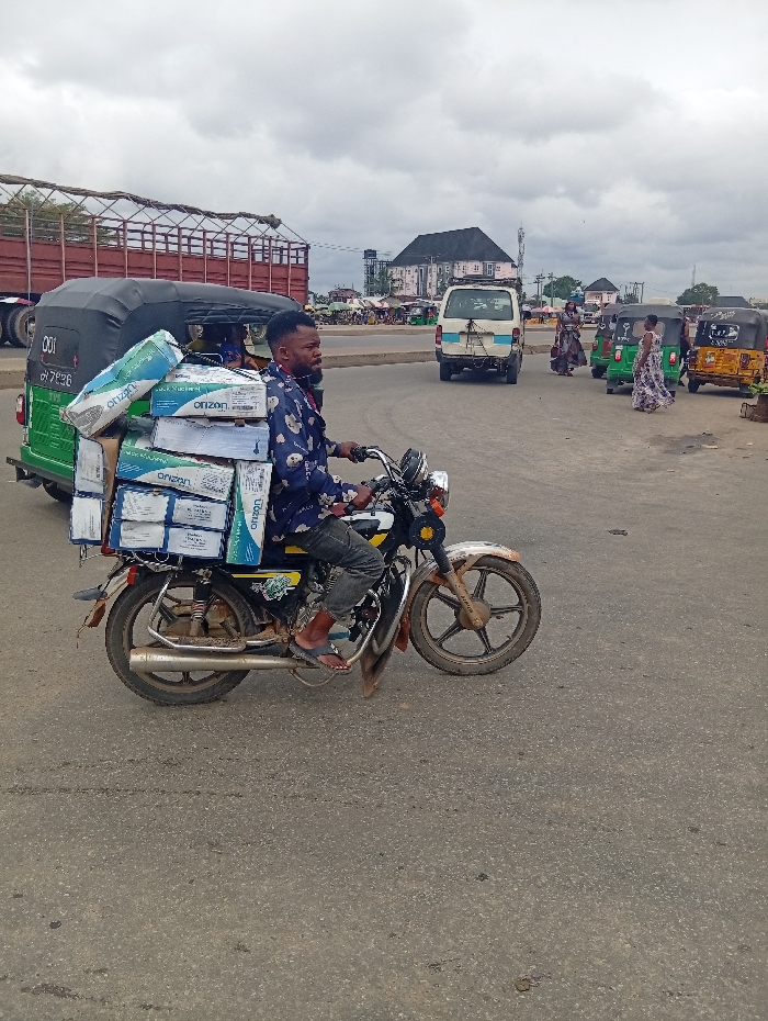 An outdoor scene on an overcast day in Ura Nta Umuarandu, Nigeria, depicts a street with vehicular and pedestrian activity. In the immediate foreground, a dark-skinned male subject, with a short beard, wearing a dark blue patterned long-sleeved shirt, dark trousers, and blue sandals, operates a dark yellow and black motorcycle. The motorcycle is heavily loaded with a stack of white and light blue rectangular packages, some marked 'Orizon' and 'Max Vision', secured to its rear seat and rack. Directly behind the motorcycle, a green motorized tricycle (Keke Napep) with the identifier "001" and "JK 7R26" is also carrying packages. To the far left, the front section of a large, open-top flatbed truck is visible. In the mid-ground, a white utility van with a blue stripe is oriented away from the viewer. Several individuals, including two women in patterned dresses, are walking on the right side of the road, where additional green and yellow motorized tricycles are present. The background includes multi-story buildings, one with a prominent dark roof, and commercial structures consistent with a market area. The road surface is asphalt, exhibiting signs of wear. The sky is uniformly overcast.