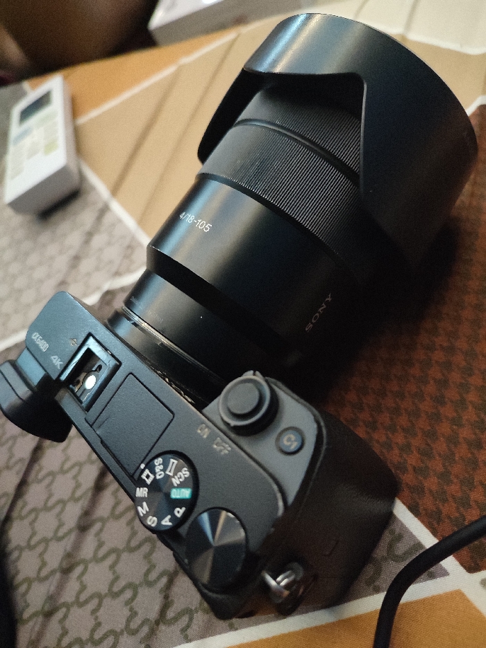 - "The scene depicts a black Sony ILCE-6400 mirrorless digital camera with a black Sony 4/18-105 lens and attached lens hood, resting diagonally on a patterned fabric surface" by FM-5oEUb2, licensed under CC BY 4.0