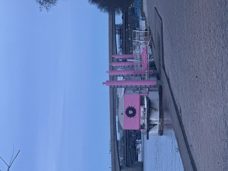 A pink and white boat with a large "O" on its side is docked next to a concrete walkway. The boat has several pink cylindrical structures. A bridge spans above the boat, and a body of water is visible. The sky is overcast, suggesting dusk or dawn. Trees are sparsely visible in the background.