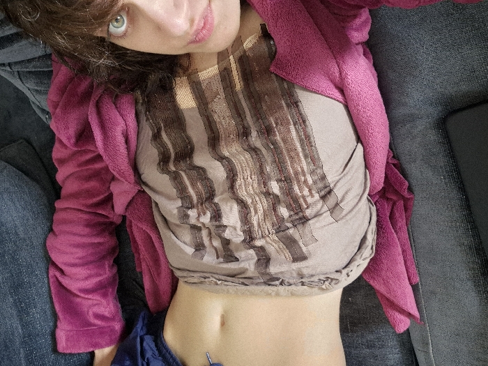 An adult female is depicted reclining indoors on a dark gray upholstered sofa. She has dark, wavy hair and green eyes, looking directly towards the camera with a slight smile. She wears a light brown, possibly sheer, top with horizontal dark brown striped patterns, partially covered by a magenta-colored long-sleeved fleece garment. Dark blue fabric, indicative of shorts or underwear, is visible near her lower abdomen, which features a small, metallic navel piercing. The image is taken from an overhead perspective. The specific location within Châtelaillon-Plage, France, is not discernible from the visual information presented.