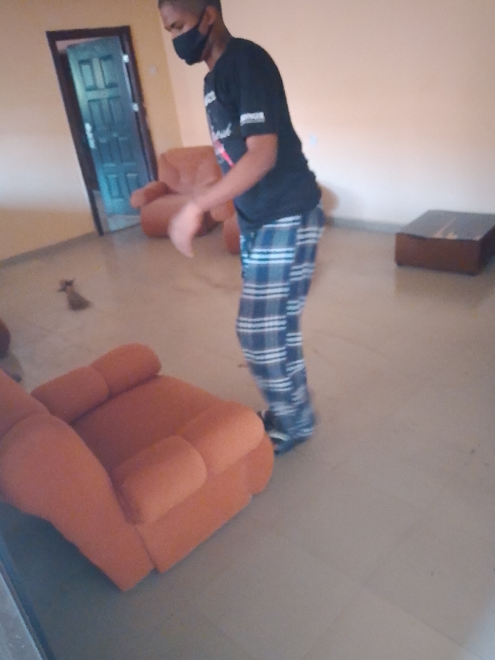 In a living room, a person wearing a black shirt, plaid pants, and a black mask stands near an orange armchair