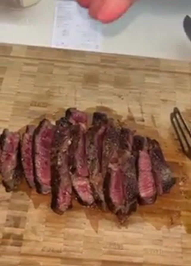 A hand sprinkles salt on a medium-rare sliced steak resting on a wooden cutting board. A receipt and a jar are visible in the background.
