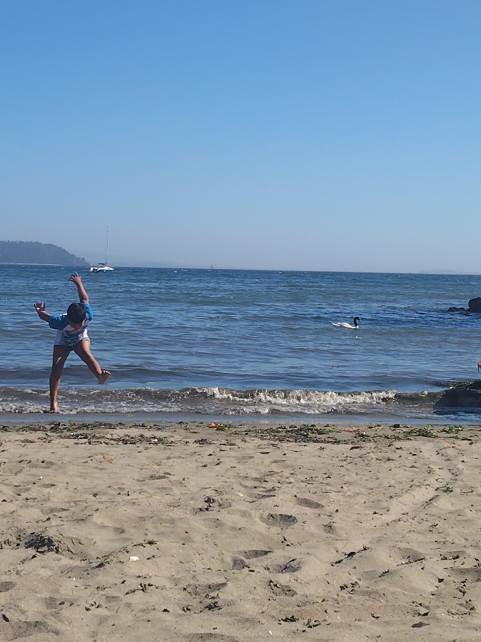 On a sunny day, a child in a blue shirt plays at the edge of the beach. The child is mid-jump, with arms outstretched. The beach has light brown sand, and a thin line of seaweed marks the high-water line. The ocean stretches out to the horizon, with small waves breaking on the shore. A sailboat is visible in the distance. A black and white bird floats in the water. Rocks are visible on the right side of the ocean water.