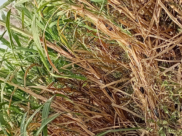 The image displays a dense agricultural field, identified as being in Nata-Ala, Nigeria. The scene is dominated by a substantial growth of sugarcane plants, characterized by tall, segmented stalks and long, strap-like leaves. A significant portion of the foliage appears vibrant green, indicating active growth, while numerous dried, light brown, and tan leaves and stalks are present, particularly in the lower half of the frame and on the ground. Smaller green ground vegetation is sparsely visible amidst the fallen plant material. No people, animals, or specific man-made objects are discernable within the frame. The environment is an open outdoor setting, likely a cultivated plantation.