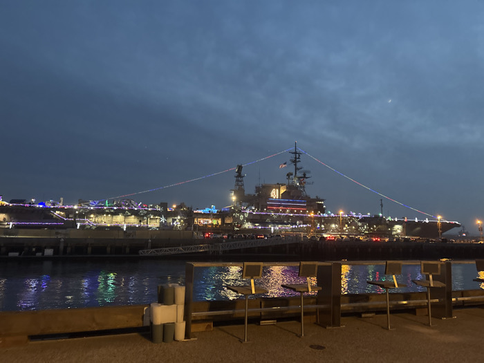 An aircraft carrier adorned with lights stands in the water at twilight. The ship is decorated with strings of colorful lights and other illuminations. The water reflects the lights, creating shimmering patterns. Foreground elements include low tables and seating on a pier. The sky is a dark blue with some cloud cover and a sliver of moon visible.