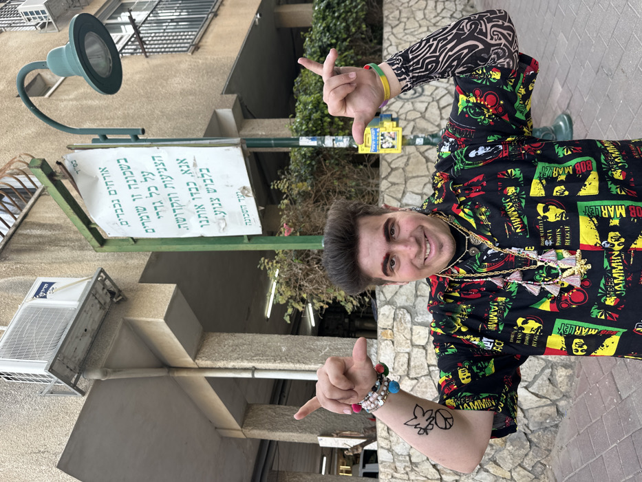 A young adult male with dark, voluminous hair and prominent reddish-brown eyebrows smiles directly at the camera. He wears a short-sleeved black shirt patterned with green, yellow, and red squares featuring images of Bob Marley and "ROOTS REGGAE" text. Multiple gold-colored chains with various pendants and colorful tassels adorn his neck. On his left arm, he wears several beaded bracelets with colorful pom-poms and a sleeve or temporary tattoo depicting a marijuana leaf within a peace symbol. His right arm displays a black and white tribal-patterned sleeve and multiple wristbands, including yellow and Rasta-colored ones. He holds both hands up, forming modified "shaka" gestures with thumbs pointed inwards and index fingers extended upwards. The scene is an outdoor setting in Bnei Brak, Israel, during daylight. Behind the man, a light brown multi-story building with a rough texture is visible, featuring an air conditioning unit and a drainage pipe on its facade, along with barred windows. To his left (viewer's right), a green metal pole supports a white rectangular sign with Hebrew text. The sign reads, "בס"ד" (With God's help), and the main message states: "Respected guests, in this neighborhood, all boundaries of modesty and holiness are maintained. Please, respect us by dressing modestly. Neighborhood Committee." Above the sign, a green street lamp with a downward-facing fixture extends from the pole. A low stone wall with irregular light-colored stones runs behind the man, and green vegetation is visible beyond it. The ground is a paved sidewalk composed of reddish-brown and gray interlocking pavers.