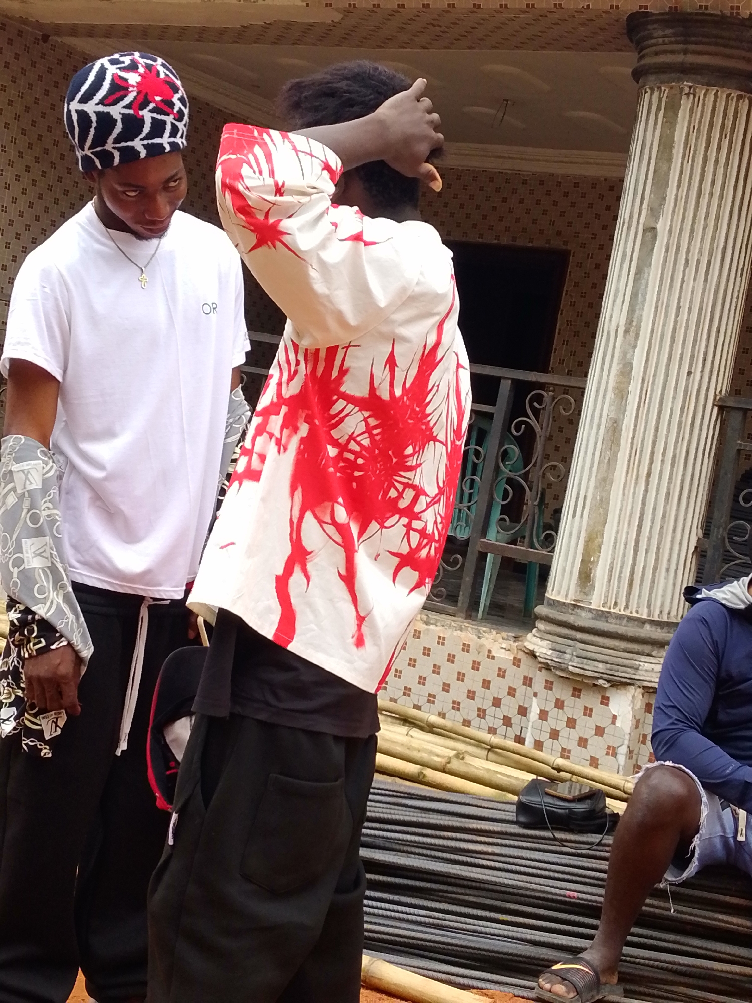 three people in Alor, Nigeria, standing and sitting in front of a building under construction. One person stands on the left, wearing a white t-shirt, black pants with white drawstrings, a necklace with a cross, a spiderweb-patterned beanie, and patterned arm sleeves. To their right, another person stands with their back to the camera. They are wearing black pants, a black t-shirt, and a white shirt with red abstract designs. A third person is seated to the right, wearing a blue long-sleeve shirt and denim shorts, and sandals. They are sitting on top of a pile of rebar rods. Behind the people is a column in front of a building with a tiled exterior. Bamboo poles are scattered around the rebar. A black bag sits on the rebar pile.