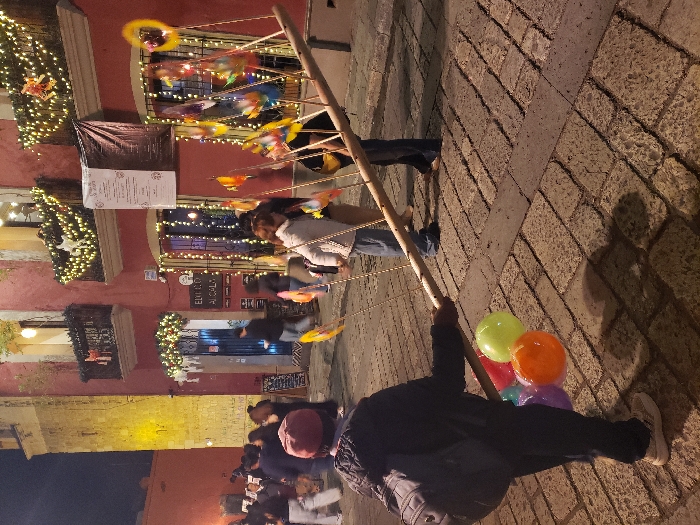 A street vendor sells colorful toys and balloons on a brick-paved street at night. The vendor, wearing a dark jacket and red hat, is seen holding a long pole with toys attached to it. There are balloons tied to the pole near him. A group of people is visible in the background. The buildings are adorned with lights and decorations, possibly for a holiday or festival. A restaurant sign is visible on one of the buildings.
