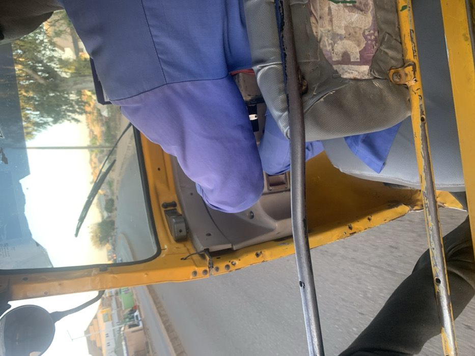 The image depicts the interior of a yellow three-wheeled auto-rickshaw, likely in motion, from the perspective of a passenger seated directly behind the driver. The scene is located in Barakin Lerawi, Nigeria. In the foreground, a gray, worn, padded seat is visible, with a blue fabric item resting on it. A horizontal, dull metal bar with two small circular holes runs across the lower portion of the frame, separating the passenger area from the driver's compartment. A second, similar bar is partially visible below the first. The vehicle's interior features a yellow metal body structure, exhibiting signs of wear, including scratched paint and exposed rivets. The driver, visible from the upper back and arms, wears a long-sleeved blue shirt and blue trousers. Their hands are positioned on the vehicle's controls, which are mostly obscured but suggest a handlebar or small steering mechanism. The driver's posture indicates active operation of the vehicle. Through the windshield, a clear view of a paved road is visible, curving slightly to the right in the distance. The road appears dry and well-maintained. On the left side of the road, various single-story and multi-story buildings are present, some with green accents, indicating commercial or residential structures. Sparse vegetation, including trees and shrubs, dots the landscape, particularly further from the road. The sky is clear and bright, suggesting daylight conditions, possibly morning or late afternoon given the soft illumination. A single windshield wiper blade rests horizontally across the lower portion of the windshield. A black side-view mirror is affixed to the exterior frame of the auto-rickshaw on the left.