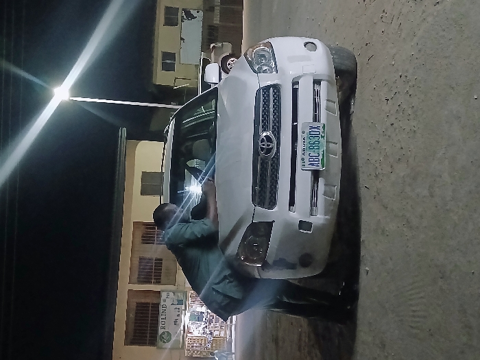 The image captures a nighttime outdoor scene in an unpaved area, understood to be located in the city of Jos, Nigeria. A male individual, dressed in a dark green long-sleeved shirt and dark trousers, is leaning forward over the front hood of a white Toyota RAV4 SUV. A distinct bright light source, possibly a mobile phone screen or flashlight, reflects off the vehicle's hood near his hands. The SUV's front license plate, "ABC 863DX", prominently displays "ABUJA" above the numbers. The vehicle's front bumper shows some minor scuffing or discoloration. In the background to the left, a two-story building with multiple windows is visible, featuring a lit sign that reads "ROLIND" and appears to include "POS" below it. Interior lights are visible through the windows of this building. To the right in the background, another building is partially discernible. The entire scene is illuminated by a bright, prominent overhead street light positioned centrally, casting a strong glare. The ground surface is uneven, appearing to be dirt or compacted gravel.