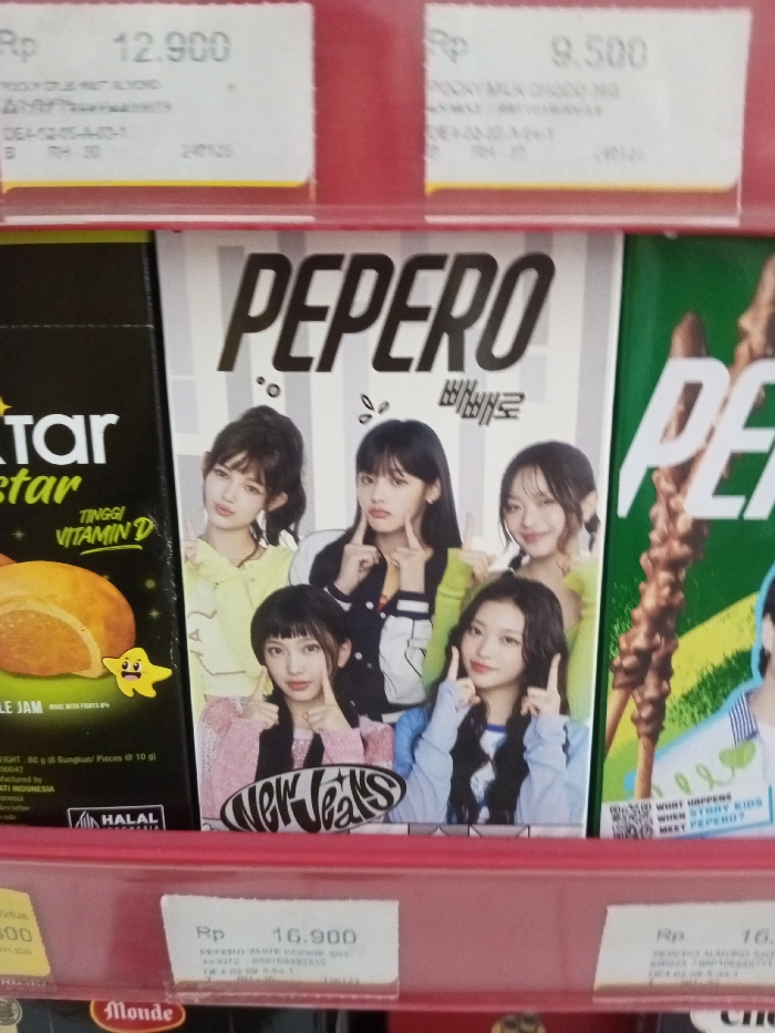A grocery store shelf displays various snack items with their price tags. The prices are listed as "Rp 12.900," "Rp 9.500," and "Rp 16.900." Among the snacks are Pocky sticks, and a box of Pepero featuring the South Korean girl group NewJeans on the packaging. Next to the Pepero box is a package of Nectar brand rolls with jam. The products are arranged closely together on the shelf, suggesting a retail environment.