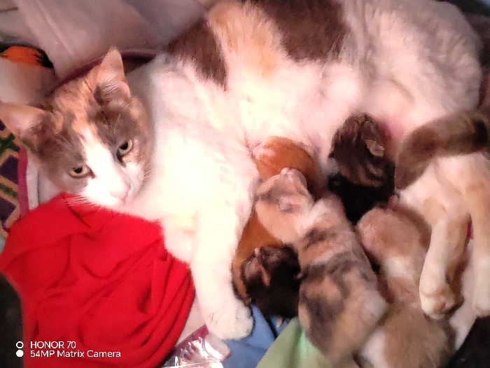 - "A calico cat lies on her side with several kittens nestled close to her belly" by FM-z9Q8u2, licensed under CC BY 4.0