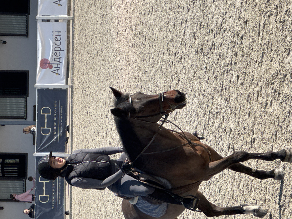 An outdoor equestrian arena in Duvanlii, Bulgaria, is depicted under bright daylight. A female rider, wearing a black equestrian helmet, a dark grey long-sleeved shirt, a black sleeveless puffer vest, dark grey riding breeches, black riding boots, and black gloves, is mounted on a bay horse. The horse is equipped with an English saddle, a light-colored saddle pad, and a bridle with reins. It is in motion, with its left front leg lifted, suggesting a walk or trot. Its head is slightly lowered and turned to the right. The arena ground consists of light-colored, raked sand. In the background, a white building with dark-framed windows spans the scene behind a white fence. Banners are affixed to this fence; one prominently displays "TACKSHOP BULGARIA" and "EQUESTRIAN SUPPLY STORE," while another shows a red logo and the Cyrillic text "Андерсен" (Andersen) followed by "Частна детска градина и ясла" (Private Kindergarten and Nursery). Two individuals, one male and one female in a pink jacket, are visible standing on an elevated platform or balcony to the far left in the background. A third female figure is partially visible behind the banners to the right.