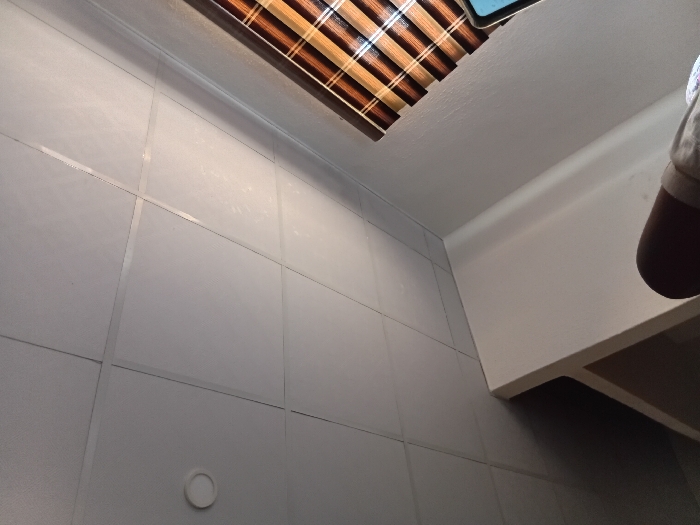 The scene depicts an interior room in Barakin Angundi, Nigeria, captured from a low, upward-angled perspective, rotated approximately 10-15 degrees clockwise. The overhead ceiling is constructed from white, square-grid suspended acoustic tiles. A single circular recessed light fixture is visible in the upper left portion of the ceiling. The right side of the frame features a light-colored, textured wall. This wall contains a window in the upper right quadrant, fitted with horizontal Venetian blinds displaying alternating brown and lighter-toned slats. In the lower right foreground, a partial view of a digital device, likely a tablet or smartphone, is present, characterized by an illuminated screen displaying a blue hue. Adjacent to the device, a human limb, clothed in light-colored fabric, is partially visible. A white, angular structure, identified as an item of furniture such as a shelf or table, extends from the lower left corner towards the center of the frame. The room is illuminated by visible overhead artificial lighting and ambient light inferred from the window and shadows.