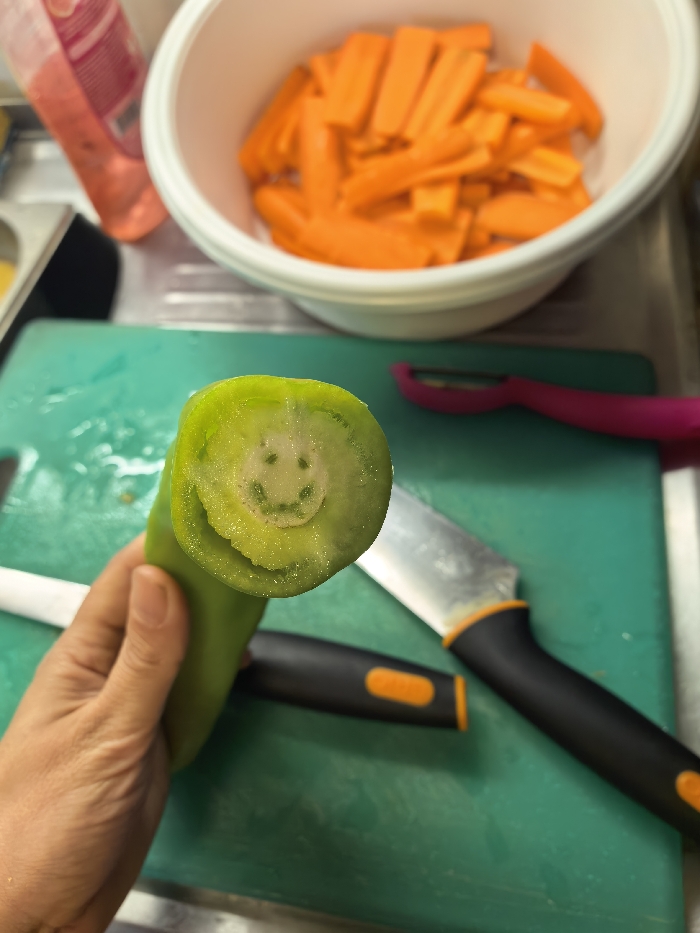 This image depicts a food preparation scene within a kitchen environment in Varna, Bulgaria. A human hand, positioned in the lower-left quadrant, holds a transversely sliced green pepper. The pepper's cut surface reveals a naturally occurring internal pattern resembling a smiley face, characterized by two circular 'eyes' and an arched 'mouth' within its lighter green core. The pepper is held above a rectangular, green plastic cutting board, which shows signs of use, including moisture. On the cutting board, a silver-bladed knife with a black handle and orange accents is visible to the right of the pepper. Another knife handle, also black with orange accents, is partially visible towards the bottom-center. A pink/magenta vegetable peeler rests on the upper-right portion of the cutting board. In the blurred background, a white bowl containing a quantity of uniformly cut orange carrot sticks is prominent. To the far left background, a clear bottle filled with a pink liquid and a metallic container are partially visible. The overall scene suggests active culinary preparation where an unusual natural phenomenon in a vegetable has been observed.