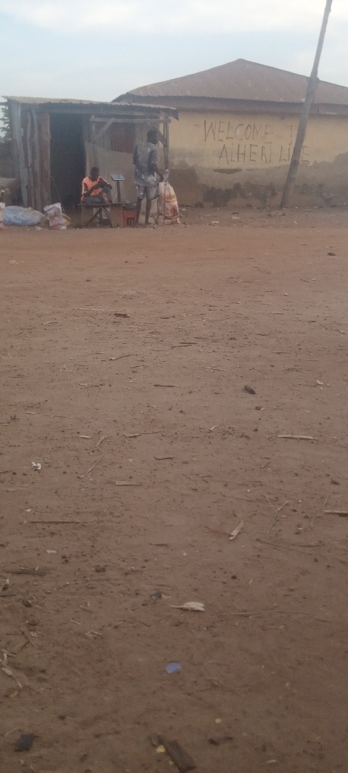 The image depicts a roadside scene in what is identified as Minna, Nigeria. The foreground consists of bare, reddish-brown earth scattered with small pieces of debris, including organic matter and plastic remnants. In the middle ground, two structures are visible: to the left, a small, makeshift stall constructed from corrugated metal sheets and wooden poles, with its front open. To the right and behind this stall stands a single-story building with light-colored, possibly stuccoed, walls and a pitched, corrugated metal roof. On the wall of this building, dark, hand-painted letters read "WELCOME TO ALHERI LIFE". Two adult males are present near the stall. One male, wearing an orange shirt, is seated inside the stall behind a small table, facing right. A scale is visible on the table in front of him. The second male is standing outside the stall, facing away from the camera, wearing a light-colored, possibly stained, short-sleeved top and dark shorts. He is positioned next to a large, light-colored sack on the ground. Various bags and items are distributed around the base of the stall. The sky above is overcast.