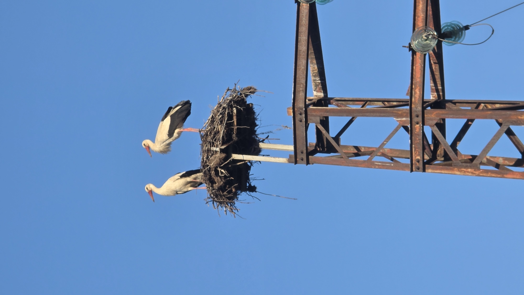 Two white storks with black wing tips, long orange beaks and pink legs stand in or near a large nest constructed on a metal utility structure. The structure is brown and rusty. Insulators attached to the structure are glass and clear. The nest is made of dark sticks and straw. The background is a clear blue sky. The location is Staroseltsi, Bulgaria.