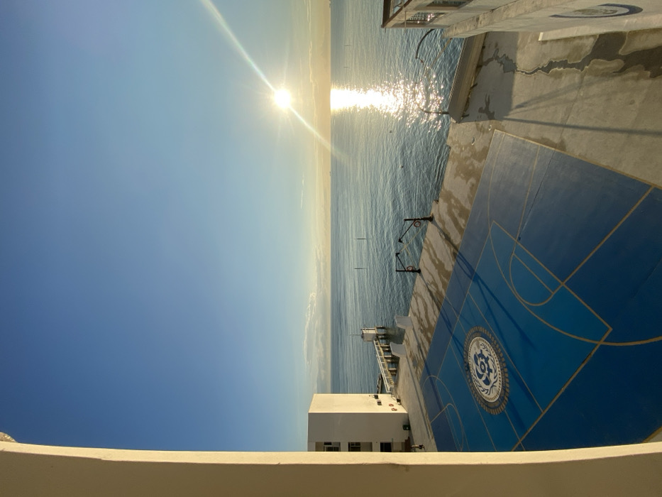 The image captures a sunrise scene at the Heroica Escuela Naval Militar in Antón Lizardo, Veracruz, Mexico. The sky is clear and bright blue, with the sun positioned low on the right horizon, emitting a strong glare and casting an elongated reflection across the calm, dark blue-green ocean surface. Several thin, dark poles are vertically visible in the nearshore water. In the foreground, a large, trapezoidal outdoor basketball court is situated on a concrete platform. The court is painted deep blue with lighter blue and white markings, including a prominent circular emblem at its center depicting a stylized rose within a gear. Long, dark shadows from an unseen structure stretch across the court from the left. Adjacent to the court, the concrete waterfront platform exhibits visible wear, cracking, and dark patches. Two black-framed basketball hoops with orange rims are mounted at the edge of this platform, overlooking the water. To the left, a multi-story white building with visible windows and balconies rises, partially framed by a beige structural column in the immediate foreground. Towards the center-left, a white concrete pier extends into the ocean, terminating in a small, multi-level white building or tower with a railing. On the right, a section of a white concrete wall or building with a partial emblem, similar to the court's, is visible. No individuals are present in the frame.