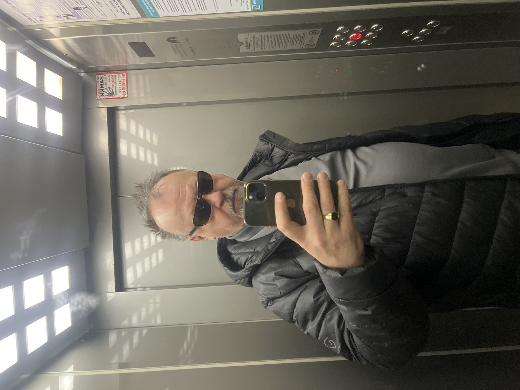 A man is taking a selfie in an elevator. The elevator has a control panel with buttons, some of which are lit up in red. There is a notice with Russian text on the wall of the elevator. The man is wearing sunglasses and a black puffer jacket. While I cannot definitively confirm the location of the elevator to be Podolsk, Russia, the Russian text on the notice suggests that the picture was taken in Russia.