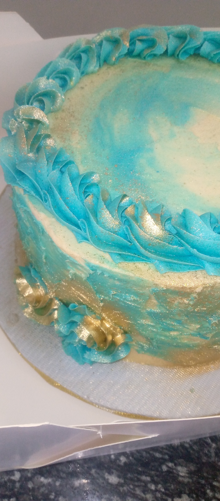 - "A close-up, high-angle view captures a round cake adorned with light blue and white/cream frosting, featuring prominent gold glitter or paint accents" by FM-OaxEf2, licensed under CC BY 4.0