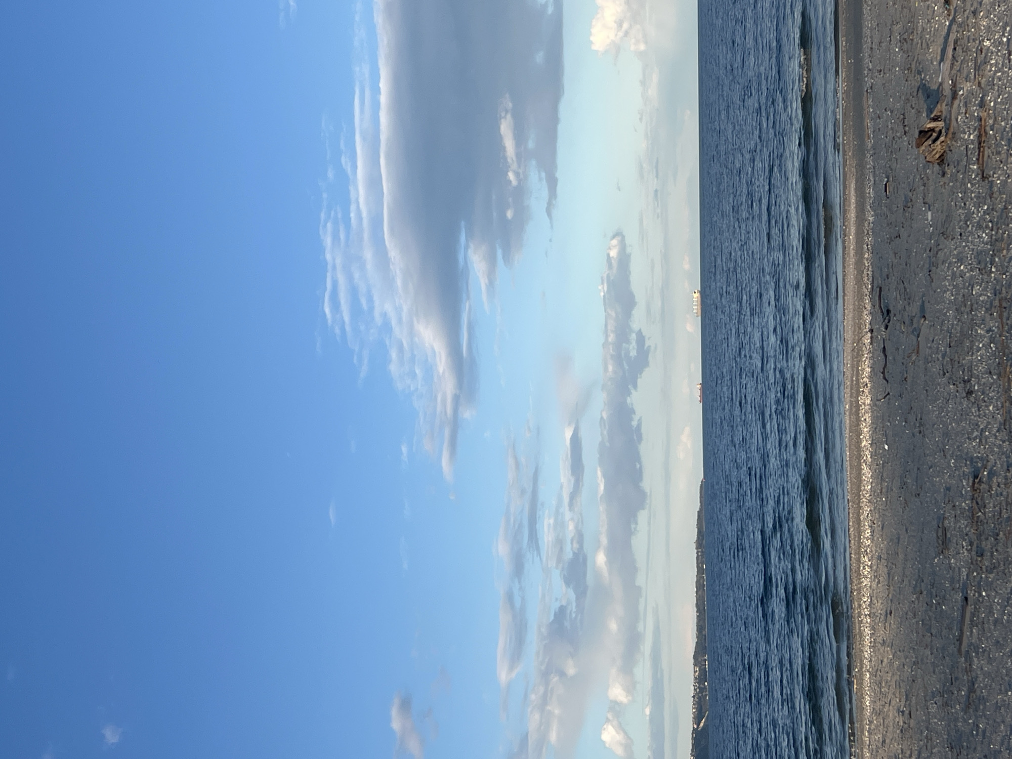The image depicts a beach scene under a partly cloudy sky. To the left, the sky is a clear blue, transitioning to clouds of white and gray toward the center. The ocean is dark blue with small waves. The beach is made of dark sand or pebbles and a few pieces of driftwood are visible. The image appears to be taken vertically, with the horizon line running roughly horizontally. There are buildings visible in the distance on the shoreline. Given the buildings, clouds and shoreline, the image could be from Varna, Bulgaria.