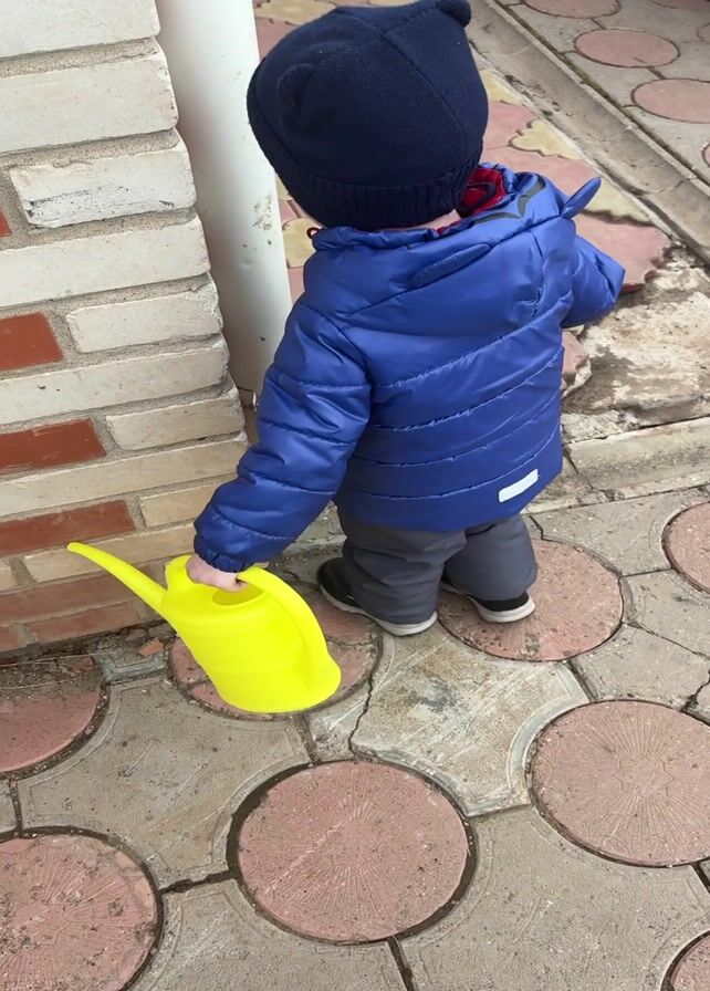 A toddler wearing a dark blue knit cap and a blue padded jacket stands outdoors on a cracked tile surface with red circle designs. The child carries a bright yellow watering can in their left hand, next to a white downspout against a brick wall. The camera is positioned above and behind the child, providing a close-up view of their back. The lighting suggests an overcast day, and the scene has a quiet, domestic feel.