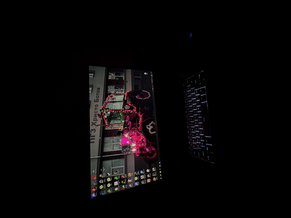 The image displays a computer monitor and a backlit keyboard in a dark setting. The monitor shows a desktop background featuring a pink tractor adorned with numerous pink and green festive lights. The tractor is positioned in front of a multi-story building. Text on the building's facade reads "ПГЗ. Христо Ботев", identifying the location as the Professional High School of Agriculture "Hristo Botev" in Yambol, Bulgaria. Numerous application icons are visible along the left edge of the monitor screen. Directly below the monitor, a compact mechanical keyboard with white backlighting is present. To the right of the keyboard, a faint blue "G" logo, indicative of Logitech branding, is discernible on the dark surface. No individuals are visible.