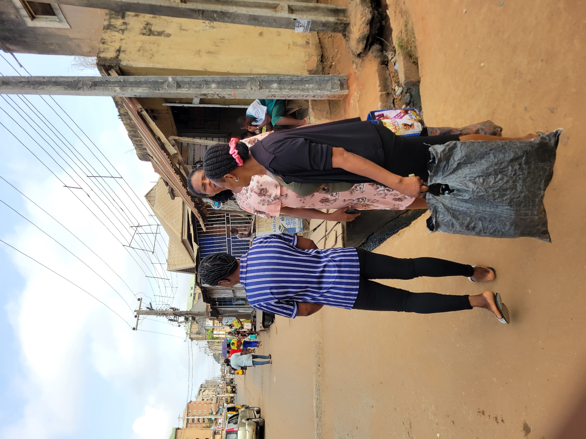 The scene depicts a bustling street in Obosi, Nigeria, under an overcast sky. Three adult females occupy the foreground on the right side of an unpaved, reddish-brown dirt road. From left to right: 1. A female, seen from the rear, wears a blue and white vertical striped short-sleeved shirt, black fitted pants, and silver flat sandals. Her hair is styled in dark braids. She stands facing down the street. 2. A female, positioned slightly behind and to the right of the first, wears a light-colored floral patterned short-sleeved dress. Her dark hair is pulled back. She appears to be looking towards the third female. 3. A female, in profile facing left, wears a dark green top, a black open cardigan, and black pants. Her dark braided hair is secured with a pink scrunchie. She holds a large, dark grey plastic bag in her right hand and a blue "Gloria" branded shopping bag in her left hand. Tattoos are visible on her left forearm. To the right of the women, a concrete utility pole stands next to an open drainage ditch. Behind them and further down the street on the right, a row of weathered single-story buildings with corrugated metal roofs and exposed concrete pillars line the road, suggesting shops or stalls. One building facade is painted a faded yellow/ochre. A male figure sits on a wooden stool outside one of these structures in the mid-ground. Overhead electrical wires crisscross the frame. Further down the street, numerous pedestrians are visible, including a male in a light blue shirt walking away from the camera. Several vehicles are present, including a light-colored SUV parked on the left and multiple yellow tricycle taxis (Keke Napep) in the distance. Multi-story buildings are visible on the left side of the street in the background. The general impression is an active urban street environment.