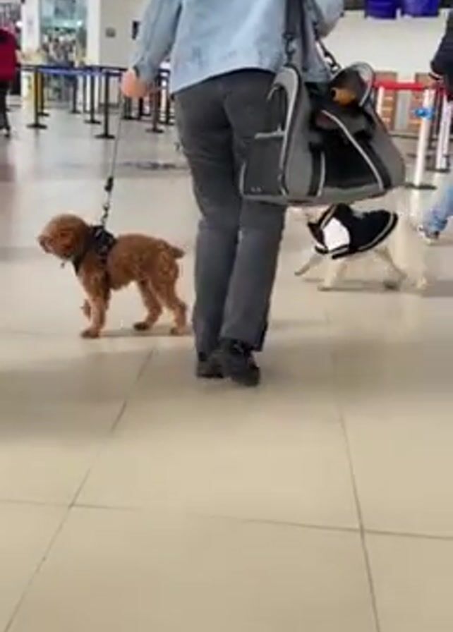 A person walks through an airport pulling two dogs on leashes. The dogs are a brown toy poodle and a white terrier mix. The person is wearing black sneakers, gray jeans, and a blue denim jacket and carrying a large grey bag over their shoulder. A child in a pink outfit walks in front of them, holding hands with another adult. Airport security line markers are visible in the background.