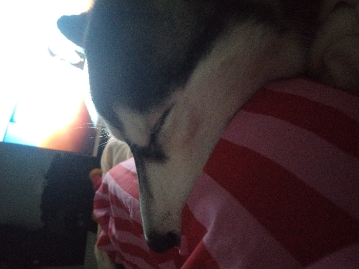 A husky rests its head on a person's shoulder. The dog's fur is a mix of gray, white, and black. The person is wearing a red and pink striped shirt. The dog's nose is just visible near the bottom of the frame. A blurred object resembling a television is visible in the background, to the left of the dog. The overall impression is one of comfort and closeness between the dog and the person.