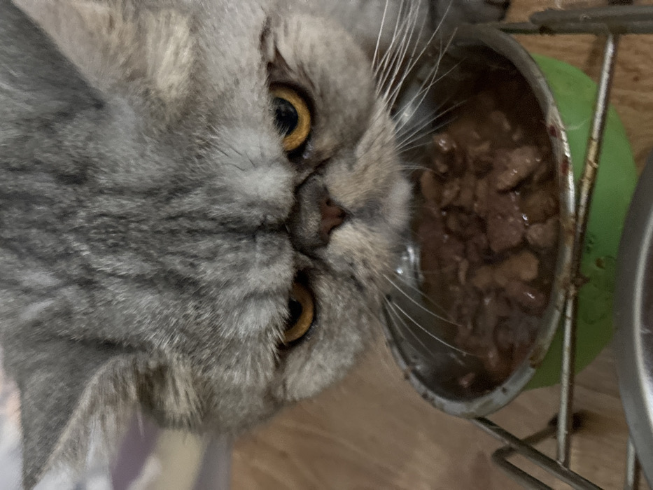 A domestic cat, exhibiting characteristics of an Exotic Shorthair or Persian breed with grey tabby-striped fur, is featured in a close-up, high-angle shot. The cat's face is prominent, displaying a flattened snout, a dark pink nose, and intense, amber-orange eyes fixed downwards. Its whiskers are visible, extending towards a silver-colored metal food bowl. This bowl contains a serving of chunky, dark brown wet pet food in gravy. The metal bowl is seated within a green plastic bowl, which is part of a two-tiered metal feeding stand. A portion of a second identical silver metal bowl is visible at the bottom of the frame. The background is softly blurred, revealing light brown flooring, consistent with wood or laminate, indicating an indoor domestic setting. The scene is situated in the city of Chaikovsky, Russia.